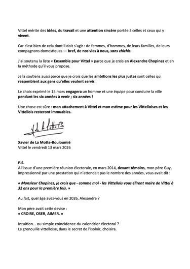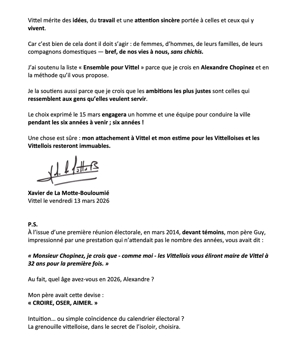Nous sommes fiers de pouvoir compter sur le soutien de Xavier de La Motte‑Bouloumié, dont le nom est intimement lié à l’histoire de Vittel et qui continue d’y vivre et d’y croire.